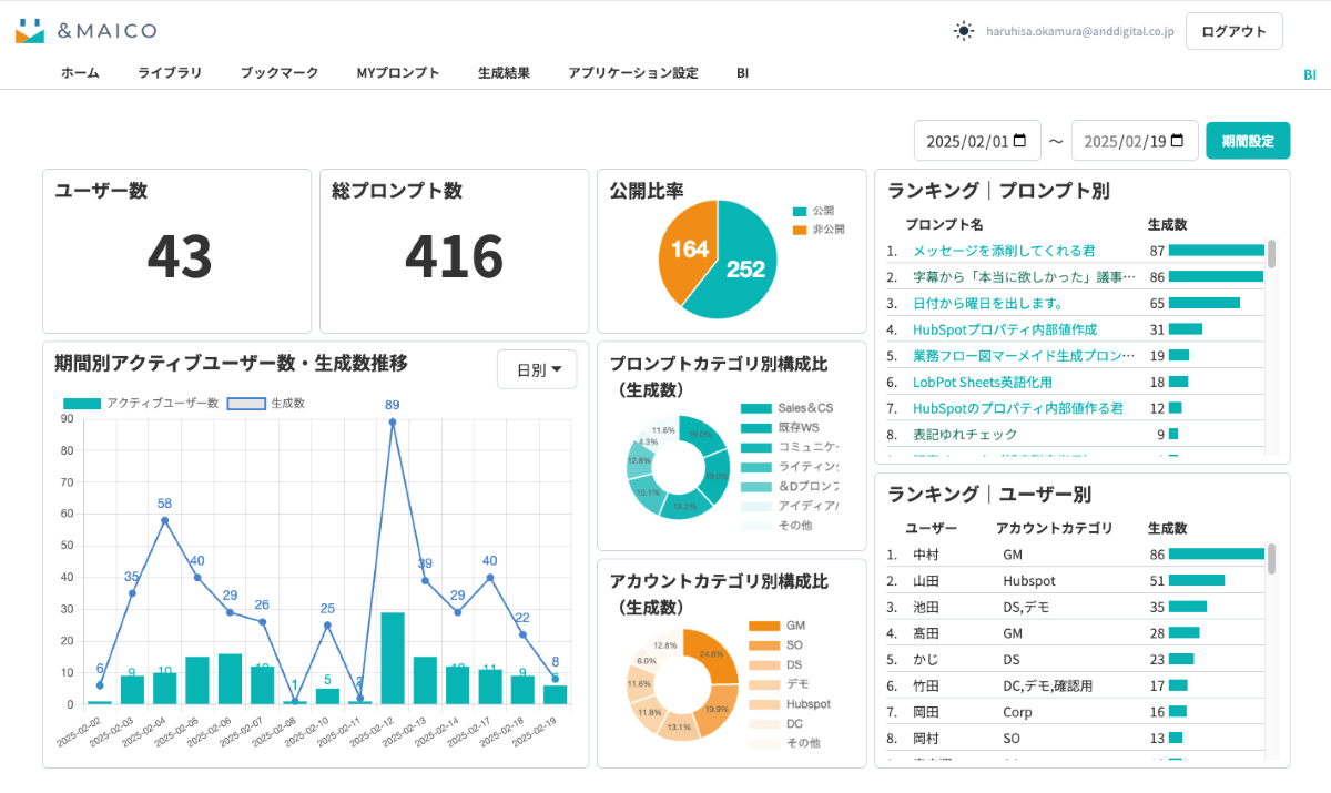 はい。プロンプトの使用回数や、「いいね」「ブックマーク」といった評価が可視化される仕組みを整えています。さらに、ダッシュボードで組織全体のAI活用状況を把握することもできます。