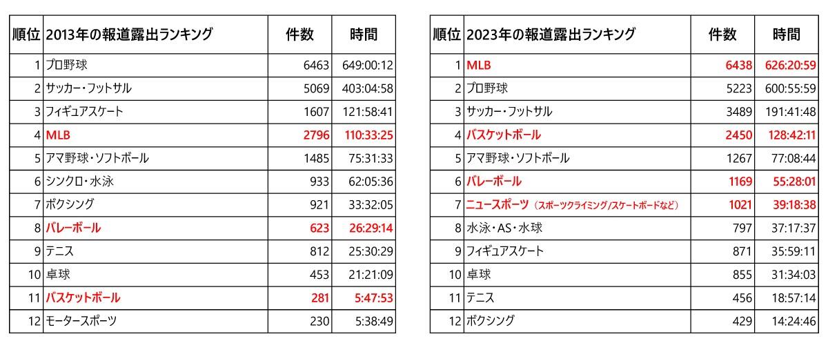 大谷翔平選手の人気を背景に、MLBは2013年の4位から2023年にはプロ野球を超えて1位に急上昇しています。Bリーグなどのバスケットボールも11位から6位に順位を上げ、露出量は約20倍に増加しました。また、スポーツクライミングやスケートボードといったニュースポーツ系は、以前はランク外だったものの、バレーボールに次ぐ位置まで浮上し、約40時間もの露出量を記録しています。これらのデータから、スポーツ競技のテレビニュース露出量が大きく変化していることがわかります。