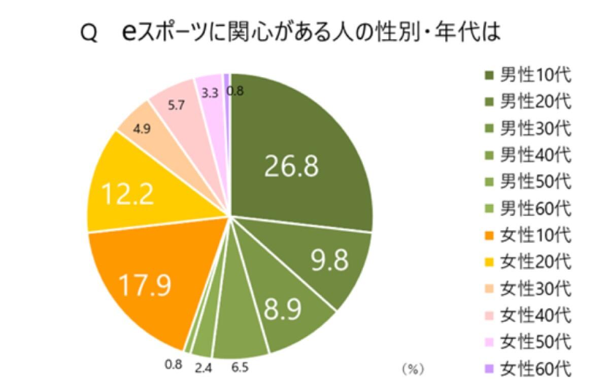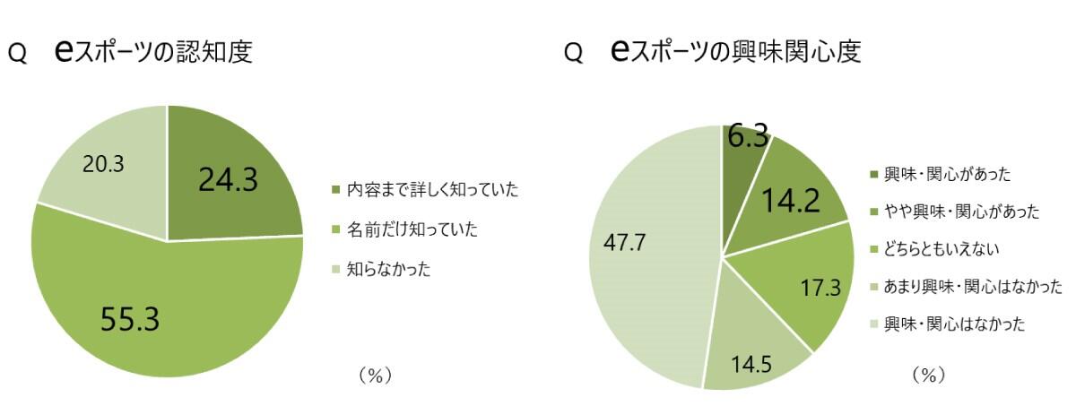 eスポーツの認知度は約8割と高く、5人のうち4人がその存在を知っていることがわかります。また、eスポーツへの関心度(「興味・関心があった」+「やや興味・関心があった」)は約2割と、一定の層が関心を寄せていることが示されました。