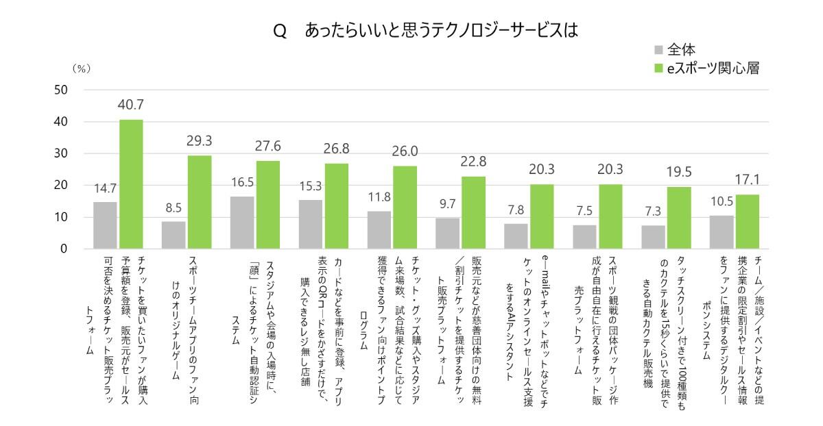 特に、「チケットを買いたいファンが購入予算額を登録し、販売元がセールスの可否を決めるチケット販売プラットフォーム」や「スポーツチームアプリのファン向けのオリジナルゲーム」への期待がトップ2でした。