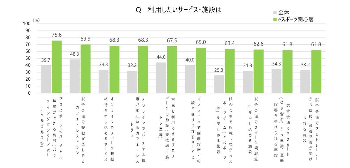 さらに、ファン向けのサービス・施設に関する利用意向(利用したい)でも、同様にすべてのサービス・施設で全体よりも利用意向が高いことがわかりました 。「プロスポーツのバーチャル体験ができる施設(バッティングセンター/バーチャルゴルフ等)」と「試合会場で観戦が楽しめるカフェ・レストラン」が利用意向のトップ2でした。