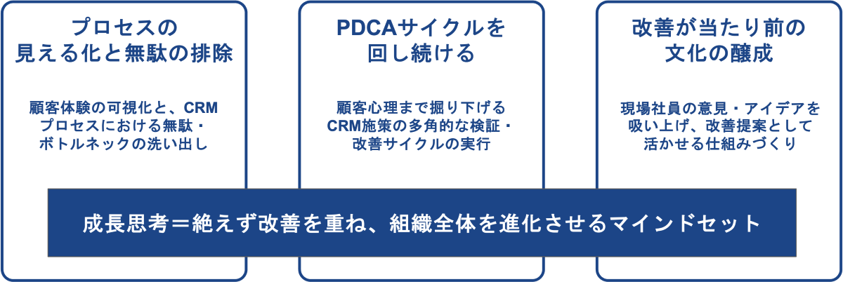 まず着手すべきは、顧客がどのような体験をしているのかを明確にし、CRMプロセスに潜む「無駄」や「ボトルネック」を徹底的に洗い出すことです。顧客からの問い合わせ対応や情報発信のフローなど、一つ一つの業務を見直すことから始めます。「成長思考」による組織の進化において顧客体験の可視化と、CRMプロセスにおける無駄・ボトルネックの洗い出しが、最初のステップです。
