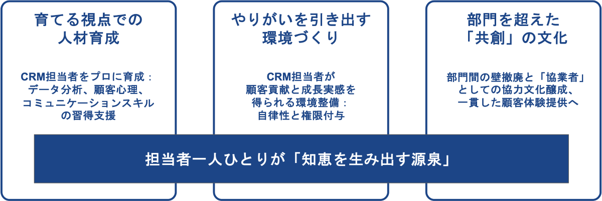 CRMの成功は、ツールやデータがどれほど優れていても、それを使いこなし、顧客と向き合う「人」の存在なくしては成り立ちません。我々は、従業員一人ひとりを「知恵を生み出す源泉」として尊重し、彼らの成長を支援し、「人の力」を最大限に引き出す組織の土壌づくりが重要だと考えます。