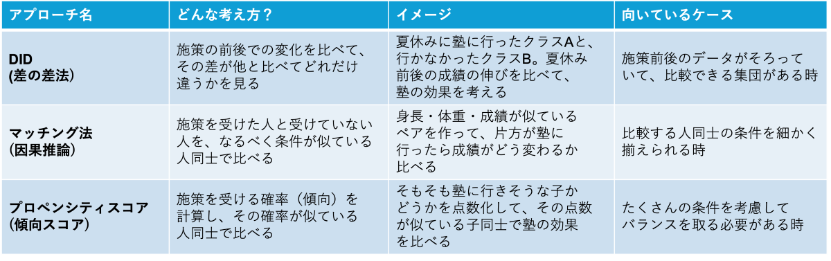 ・マッチング法:類似属性のコントロール群を統計的に作り出し、純粋な施策効果を推計します。