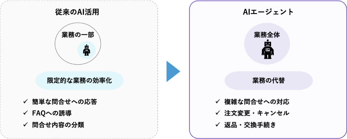 従来のCRM領域におけるAI活用は、主に担当者の業務を効率化することに主眼が置かれていました。例えば、カスタマーサポート領域では問合せ内容の分類やFAQの自動応答、営業領域ではリードのスコアリングや商談の受注確度予測がこれに当たります。これらは確かに業務効率化に貢献しますが、その効果は限定的でした。