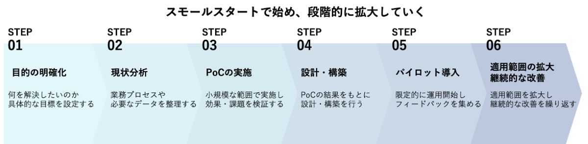 だからこそ、AIエージェントの導入は「スモールスタートで始め、段階的に拡大していく」ことが成功の鍵となります。まずは具体的な成果が見込める領域から着手し、成功体験を積み重ねながら、徐々に適用範囲を広げていくアプローチが成功への近道です。