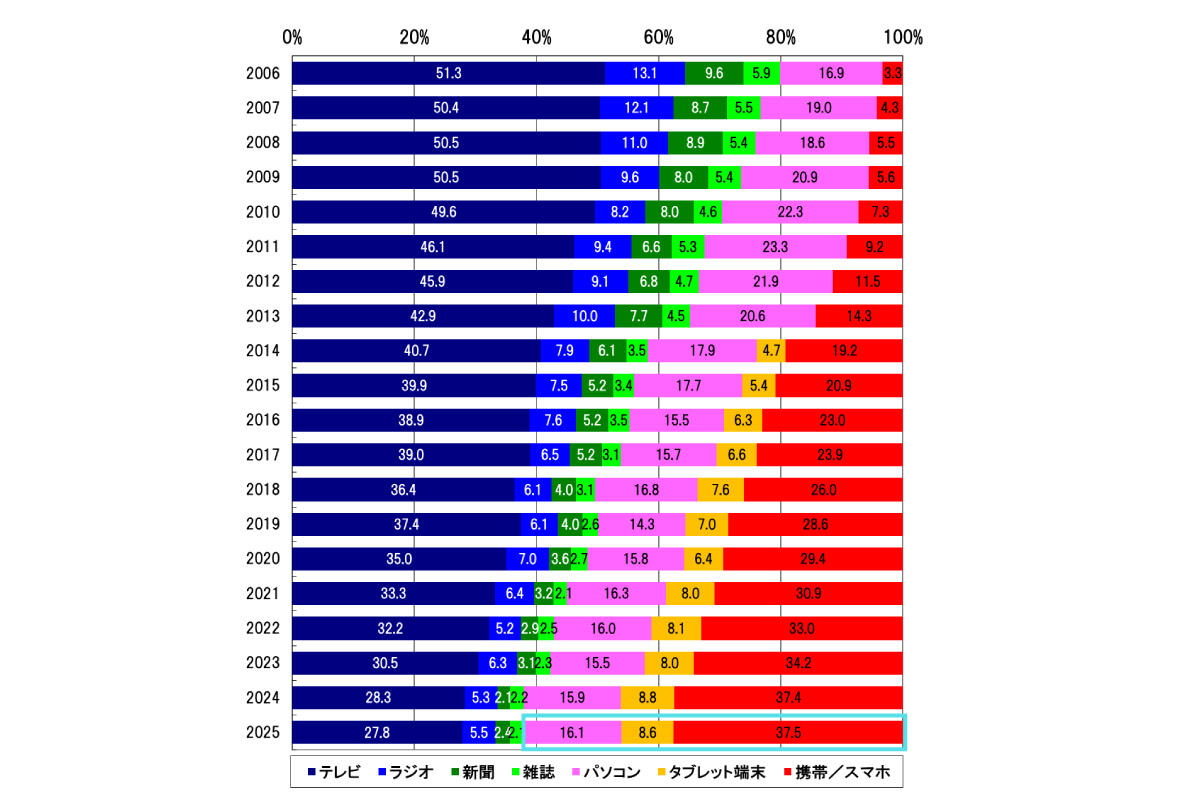 博報堂のメディア環境研究所が行ったメディア定点調査の結果を見ると、パソコン、タブレット、携帯電話/スマートフォンを合算したデジタル、すなわちインターネットの接触時間のシェアは6割を超えています。