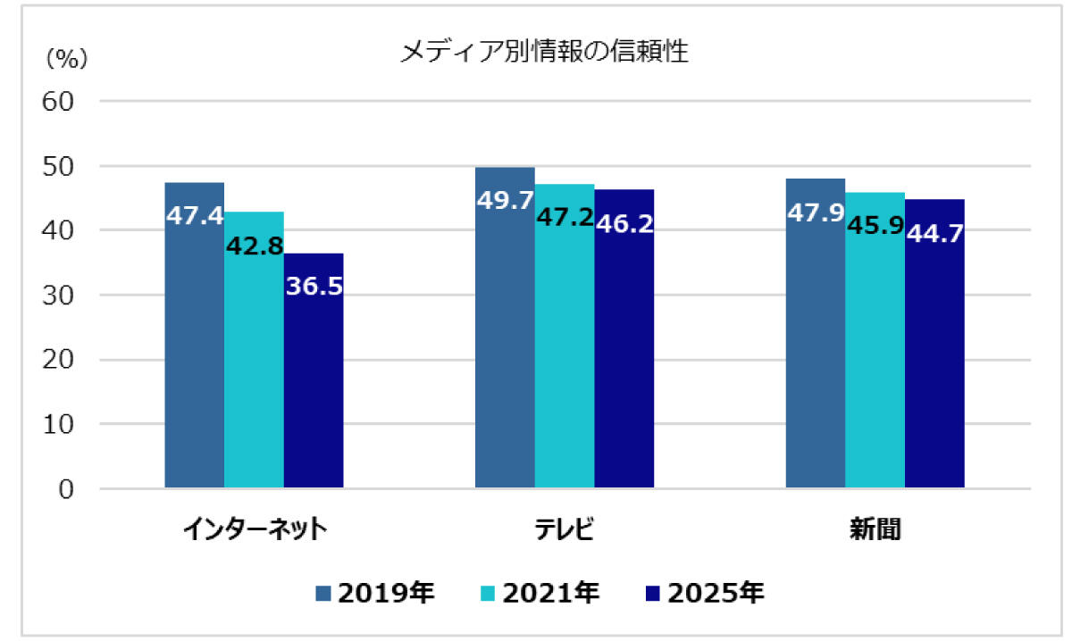 一方で、JIAA(日本インタラクティブ広告協会)「インターネット広告に関するユーザー意識調査」の「メディアの信頼性」の項目を時系列で見ると、信頼性が高い上位3メディアであるテレビ、新聞、インターネットのうち、インターネットメディアが大きくスコアを落としているという結果が出ています。