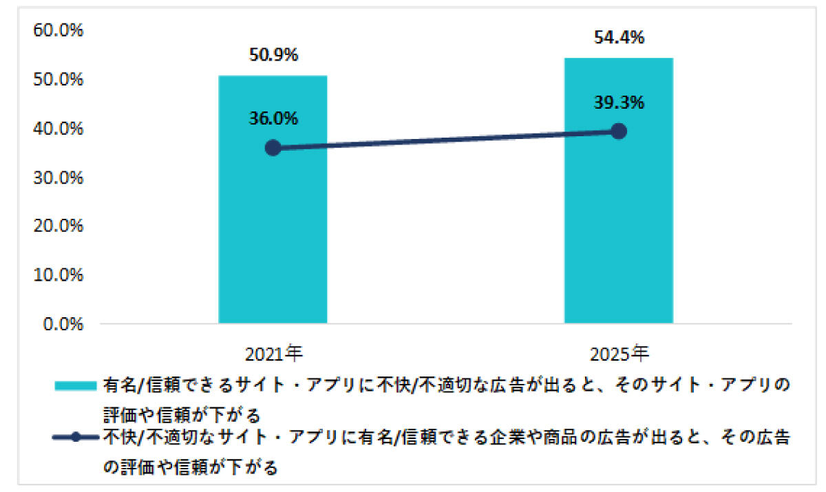 JIAAの「インターネット広告に関するユーザー意識調査」の結果で注目したのは、「有名/信頼できるサイト・アプリに不快/不適切な広告が出ると、そのサイト・アプリの評価や信頼が下がる」と回答した人が過半数、「不快/不適切なサイト・アプリに有名/信頼できる企業や商品の広告が出ると、その広告の評価や信頼が下がる」と答えた人も約4割、2021年と2025年を比べるとどちらの項目も増加していたことです。サイトか広告のどちらかを信頼できていたとしても、どちらかが信頼できない場合、信頼できない方に引っ張られてしまうという現状がわかります。