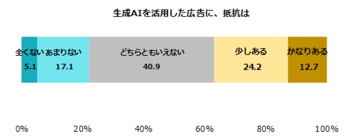健全性という意味で、昨今インターネット空間に大きな影響力を持つのが生成AIです。JIAAの調査結果でも、「生成AIを活用した広告に抵抗がある」という人が多く、抵抗がない人は2割ほどであることがわかりました。