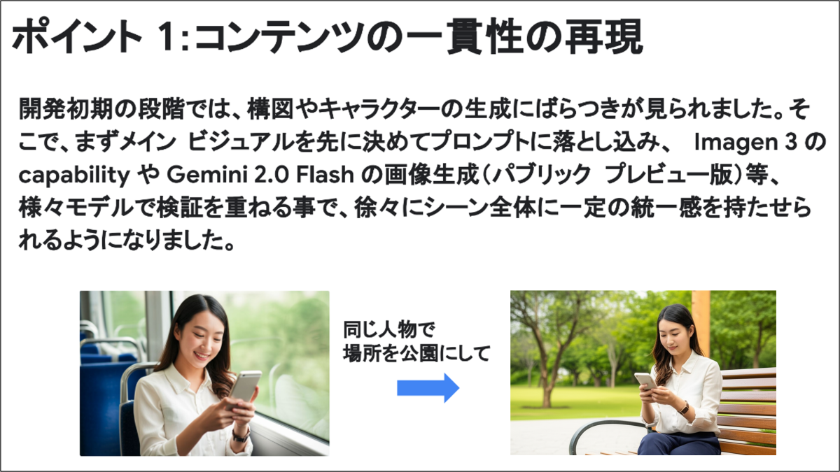 まず1つ目は「コンテンツの一貫性」です。AIを活用したクリエイティブで制作では、コンテンツ全体に一貫性を持たせることが難しく、開発の初期段階では、シーンごとに出てくる登場人物が別人になってしまったり、部屋の雰囲気ががらりと変わってしまったりといった問題が頻発しました。そこで、先ほどの動画にあった、企画全体のメインビジュアルの方向をあらかじめ定めるステップを入れました。この画像をプロンプト化し、さまざまな部分に引き回すことで、コンテンツに一定の一貫性を持たせられるようになりました。
