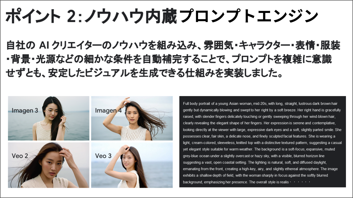 2つ目は「AIクリエイターのプロンプトノウハウを内蔵している点」です。AIクリエイターのプロンプトは、キャラクターの顔、性別、だけではなく、表情、光の当たり方まで細かく指定します。最近では、JSONやYAMLで書くとさらに精度が上がるといわれていて、1,000文字を超えるプロンプトになってしまうことも珍しくありません。