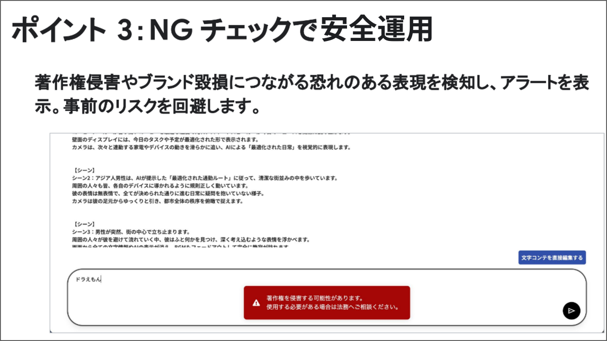 特にクリエイティブ系AIの場合、例えば少年誌の有名キャラクターの名前を打ち込んだだけで、ほぼそのものが生成されてしまうことがあります。これはシステム利用者本人に全く意図がなくとも著作権侵害につながりかねません。そのため、利用者に安全に使ってもらうために、危ない表現は生成前にきちんとアラートをかけて制御するという機能を備えています。