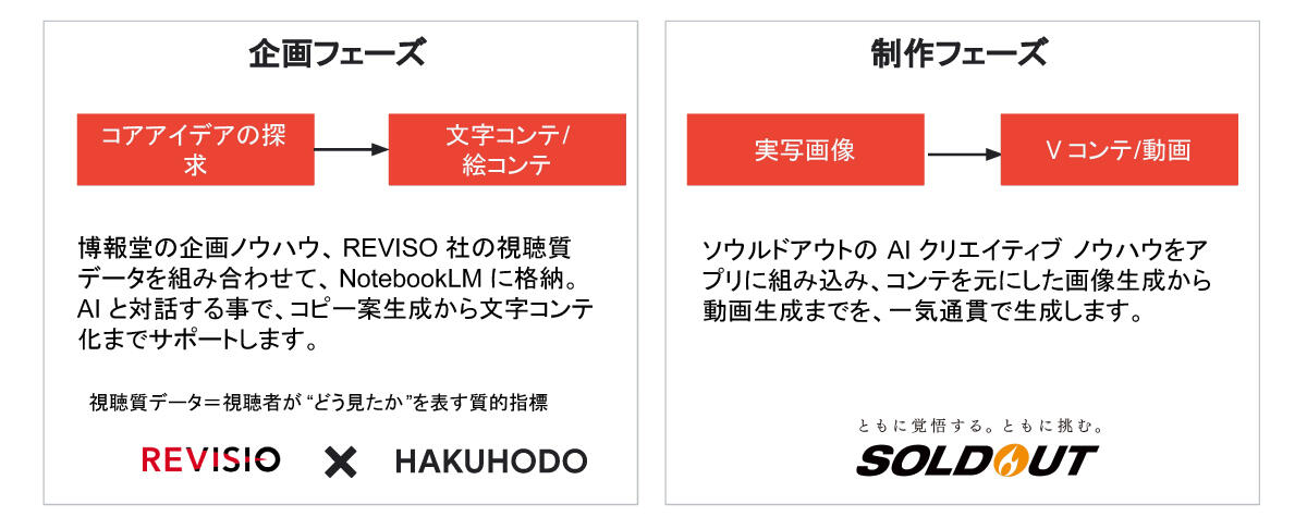 本仕組みは、大きく分けて企画と制作の2つのフェーズからなっています。まず企画のフェーズでは、グループ会社の博報堂の企画における知見や、パートナー企業のREVISOさんが持つ、視聴者が映像をどのように見ているかをカメラで計測し、数値化した視聴質データを活用しています。企画のノウハウデータと視聴質データ、この2つのデータを掛け合わせた新たなデータをつくり、そのデータをNotebookLMに格納、AIと対話しながらアイデア出しを行い、文字コンテの半自動化までを仕組み化しています。