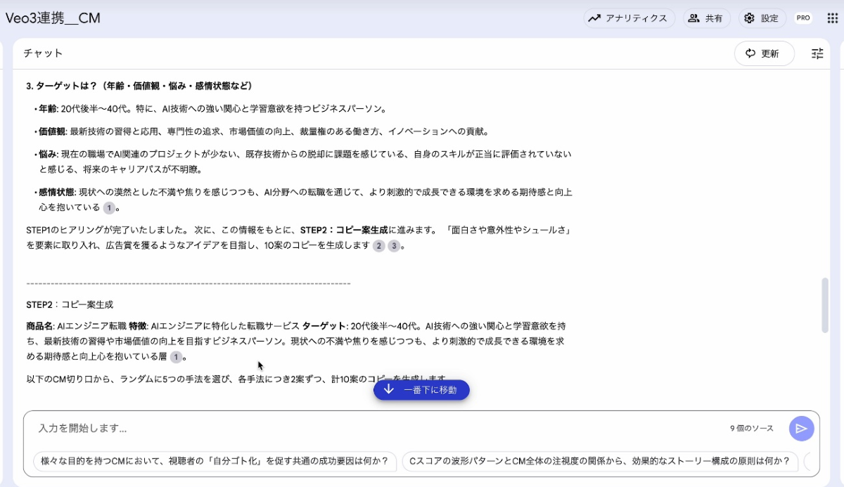 商品の特徴を求められているので、「AIエンジニアに特化した転職サービス」としました。次のターゲットはAIに任せてしまいましょう。ターゲットとコピー案が生成されました。ここでAIと対話し、内容のブラッシュアップや別解を探れるようになっています。