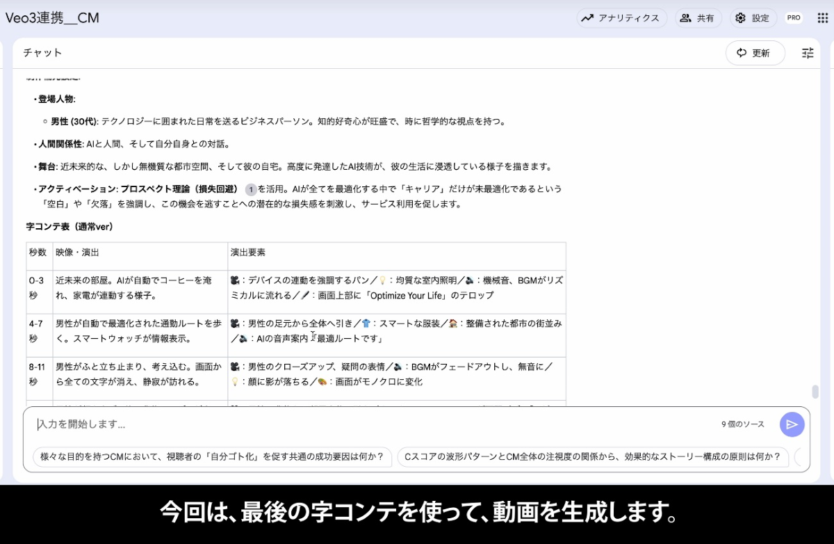 そして制作のフェーズでは、私を含む、ソウルドアウトのAIクリエイターのノウハウをシステムに落とし込み、企画フェーズでつくられた文字コンテの内容を元にイラストをImagenで生成したり、Veoを活用して映像化したりといった制作プロセスを仕組み化しています。