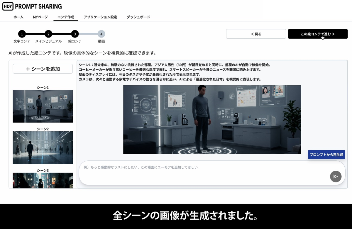 メインビジュアルが確定したら、そのトーンで全シーンの画像を生成していきます。ここもAIと対話することで、ブラッシュアップが可能なつくりになっています。