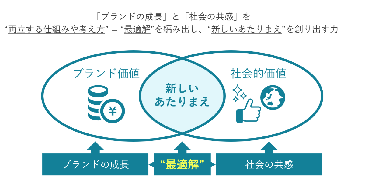 企業やブランド側の経済的な成長と、社会課題の解決といった社会的価値。その両方を掛け合わせた "最適解"をつくりましょうというのが「社会デザイン発想®」の根幹。これを両立させるためのアイデアを生み出し、実際のアクションまで一貫して行うことが我々の提供価値です。