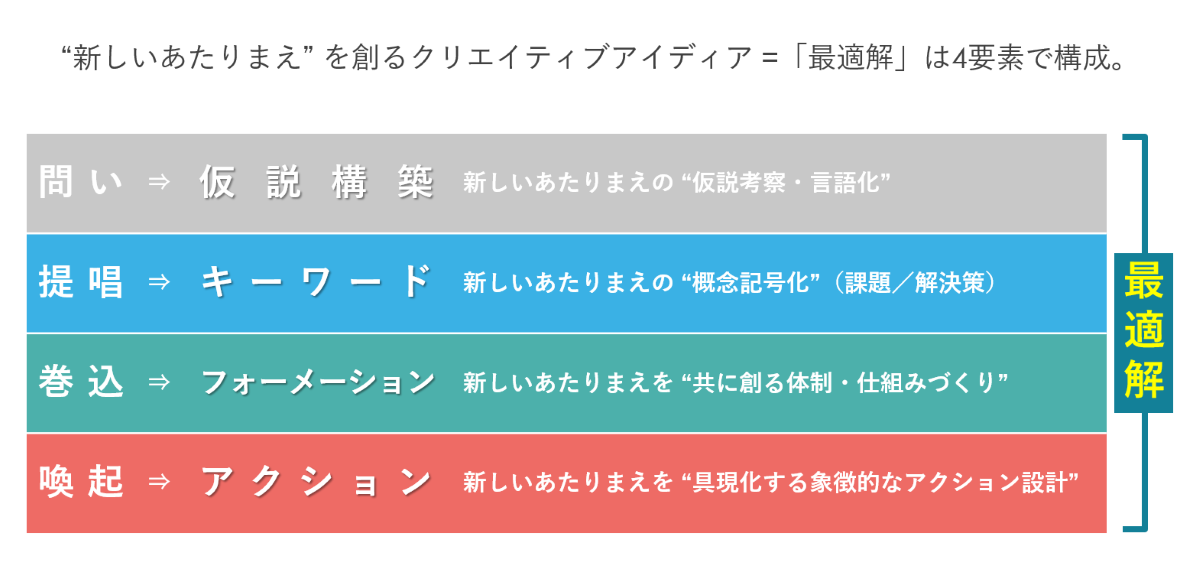 一つめが「問い」。これは得意先の与件から、社会的な課題や疑問を見出すプロセス。企業にとってのマーケティング課題だけでなく、本当の課題はなにか、を見つける役割ですね。