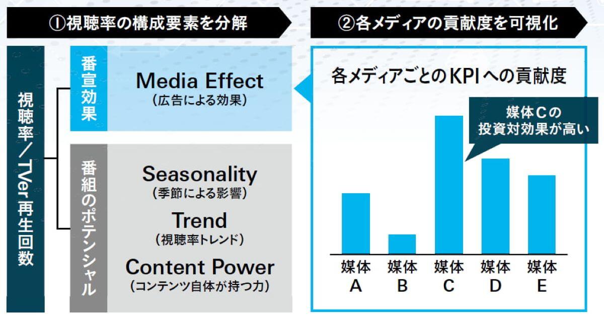 國吉:今回の取り組みでは「日曜劇場」の過去12番組について、各番組の視聴率とTVer再生回数の2つのKPIに対し、地上波スポット等テレビでの番宣施策と、InstagramやX、TikTok、YouTubeなど、各デジタルメディアにおける番宣施策がそれぞれどの程度KPIに寄与したのか貢献度を算出しました【図】。