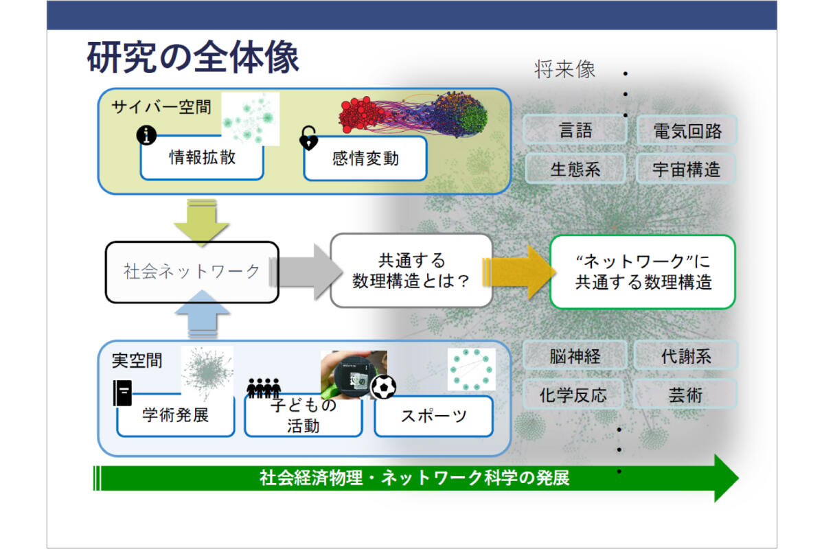 私はもともと宇宙に興味があって物理学に進んだのですが、次第に社会現象に興味が湧いて、現在はSNSのような「サイバー空間における情報拡散」や、そこにおける目に見えない空気感や感情をどう測るか、といったことを研究しています。また、ネット上に限らず、実空間におけるさまざまなネットワーク構造も含めて、それらに共通する数理構造を探っています。