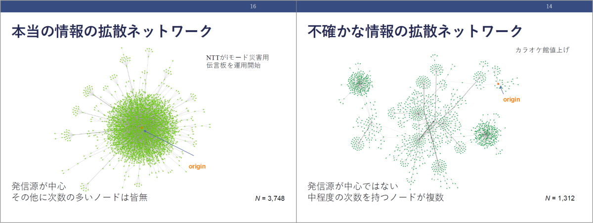 ネット上の情報の流れというのは、直接的に目には見えませんが、ひとつの方法として「情報拡散のネットワークがどのような形をしているか」を観察することができます。正しい情報が広がる時、多くの人は一次情報を引用するのですが、不確かな情報だと多くの人が又聞きした情報を引用していくので、情報が広がる「形」が異なります。