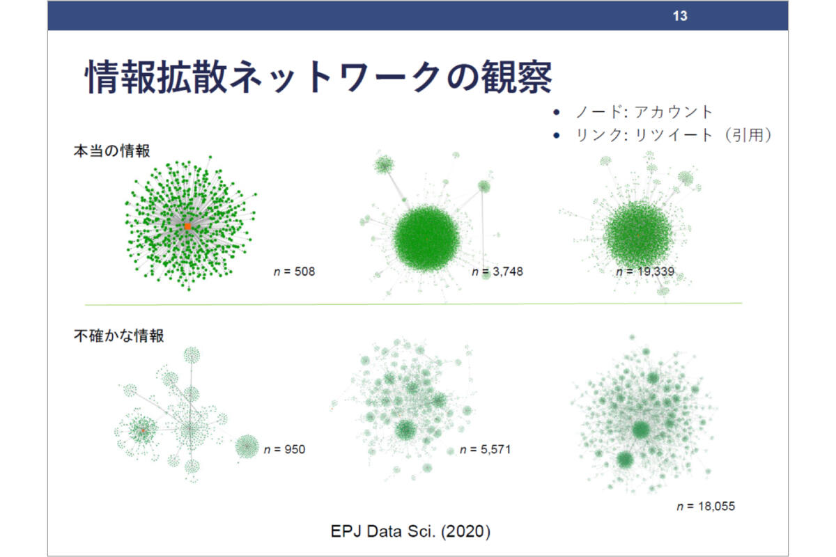 研究を進めると、本当の情報かデマかどうかは、この拡散ネットワークの形によって指標化できるとわかりました。つまり、拡散ネットワークを見れば、ツイートの中身を読まなくても、真偽をある程度見抜くことができるわけです。