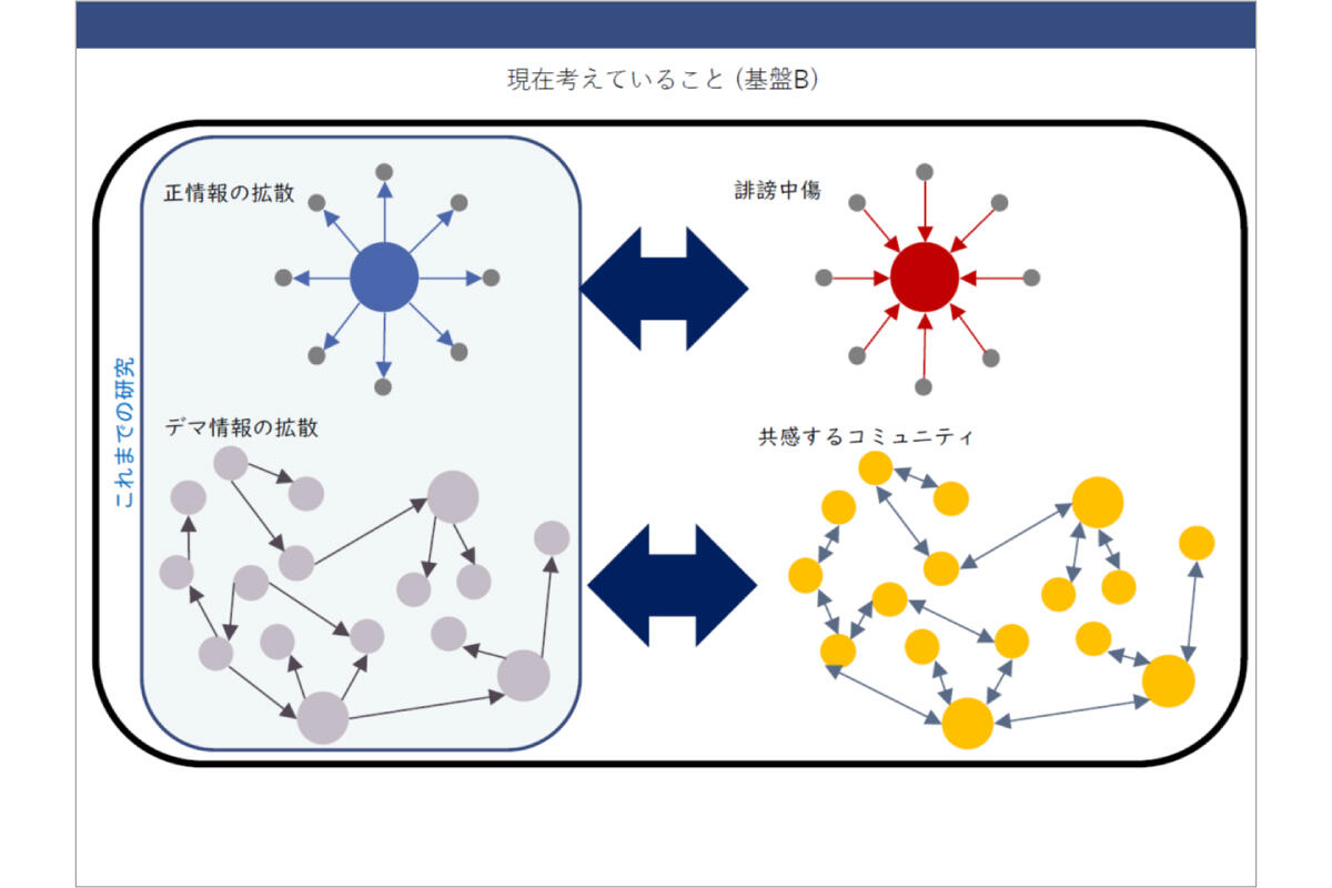 ご指摘のように、こういったネットワークモデルには、情報の流れだけではなく、「どのくらい信じているか」という観点からも複数のモデルがあります。ここまでお話しした研究は初期段階なので、いちばんシンプルな方法で進めていますが、細かく見ると、やはり「自分に近い意見を取り入れたときに拡散する」「自分と遠い意見はそもそも取り入れない」といった傾向はあると思います。