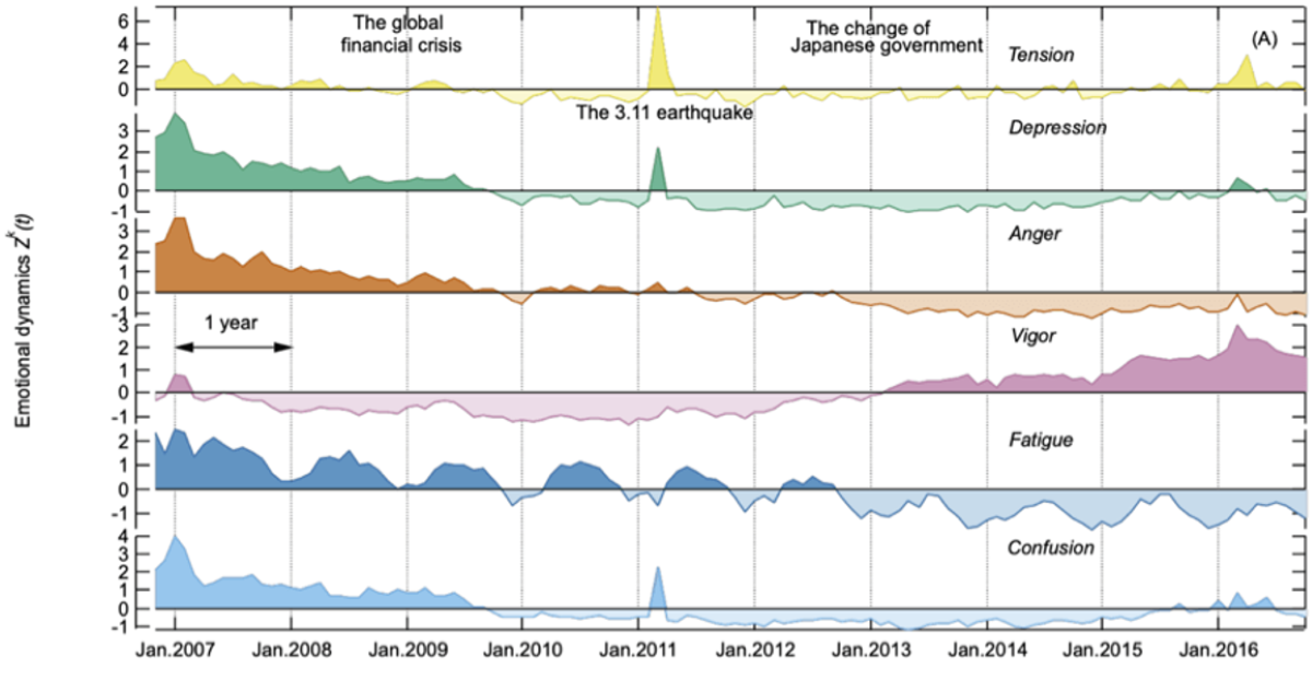 つながるイメージはあるのですが、まだそこまで研究しきれていない状況ですね。今ある程度わかっているのは、「集団感情」は数値化できるということです。2011年の東日本大震災の前後、ブログでどのようなワードが多く使われていたか調査すると、震災翌日の3月12日には下図の一番上の「Tension(緊張、不安)」を表すワードが最も高く跳ね上がり、次に「Depression(落ち込み)」「Confusion(混乱)」が高くなっていました(図6)。