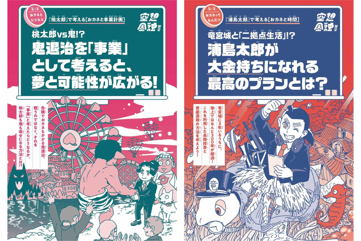 たとえば「桃太郎」なら、鬼退治を事業として捉えたらどうなるかを考えてみます。鬼をビジネスパートナーとして鬼ヶ島を不動産開発し、テーマパークをつくって観光地にしていけば、桃太郎が潤うのはもちろん、鬼も豊かになって略奪する必要がなくなる。さらには住民も鬼に襲われる恐怖から解放され、Win-Win-Winの関係が築けるというわけです。「浦島太郎」なら、竜宮城にいた間、地上で経過していた300年という時間を味方につけて、地上と竜宮城の二拠点生活をしながら堅実な資産運用を成功させる......といった具合です。そうした架空の物語に対して、投資、信託、法律など、みずほ銀行さんの各専門部署の方に先生として登場いただき、監修と解説を行ってもらいました。また、どの昔話をどのテーマに結びつけるかは、基本的に空想科学研究所の柳田先生、みずほ銀行さんと私たちの3者で、アイデアを出し合いながら考えていきました。