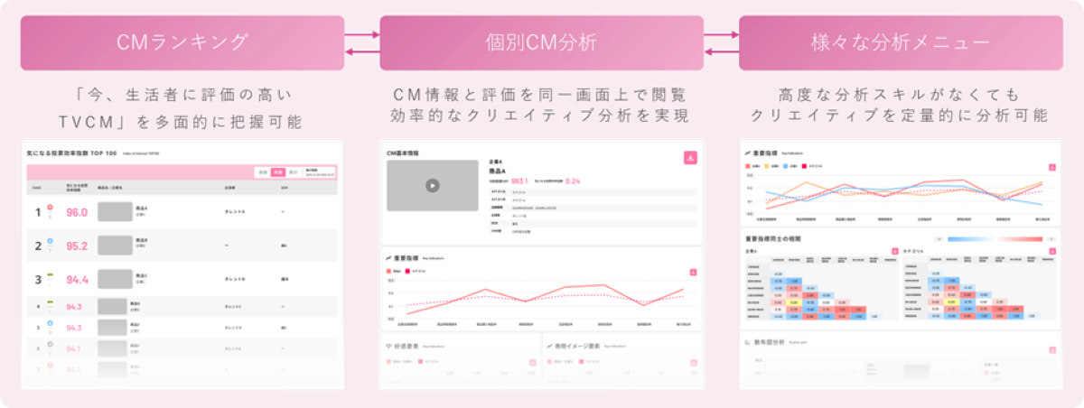「CMランキング」「個別CM分析」「豊富な分析メニュー」の3つが主な機能です。