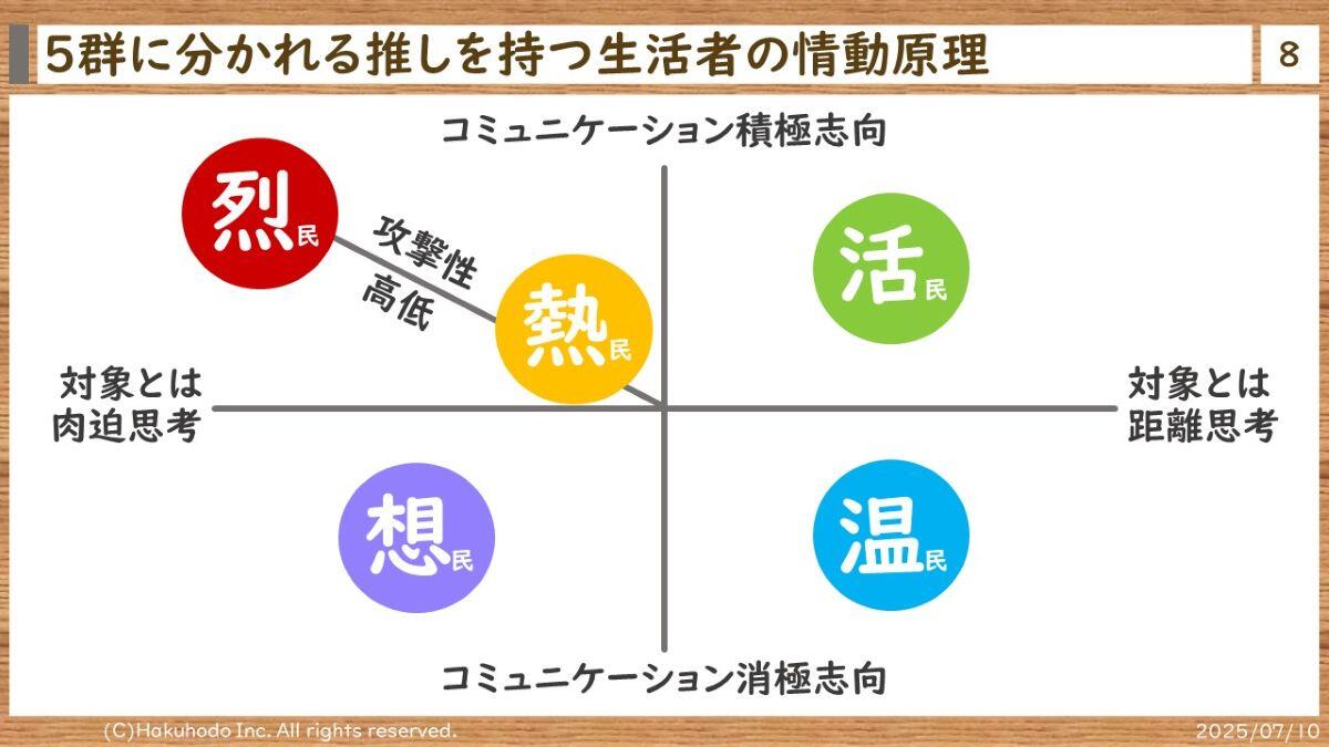熱(ねつ)民: 認知されたい欲求が強く、情報発信も盛んですが、「烈」に比べて攻撃性は低めです。