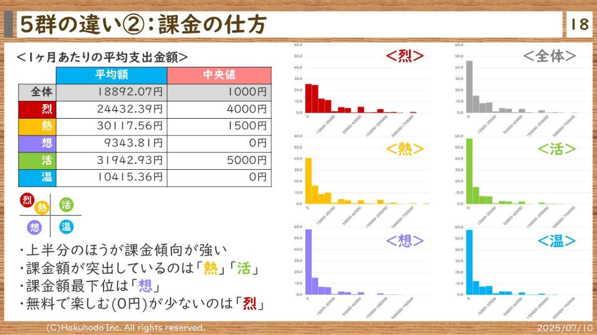 常田:定義によると思いますが、先ほどの分析でいうと、平均課金額は半年間で18万なので、スーパーファンといいつつも定義としてはおそらくそこまで高額の課金額を想定してはいな いと思っています。とはいえ、「烈民」「熱民」「活民」が入り混じった集団であることは確かで、そこをどう分類しどうバランス取っていくかというのは、テーマとして面白いと思いました。