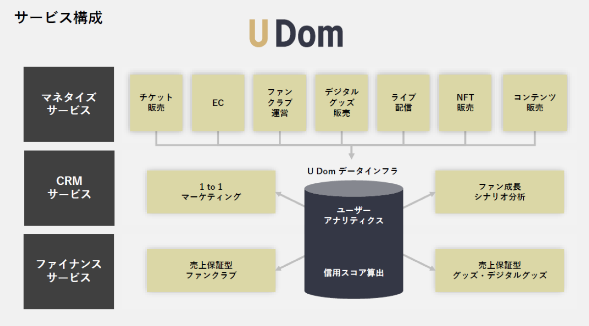 常田:まさにおっしゃる通りです。その上で、具体的なサービス構成としては、まずはチケット販売、EC、ファンクラブ運営など1つ1つのマネタイズポイントを統合的に提供するマネタイズサービス。また、データを1箇所に集めることで提供できるCRMサービスがあります。そして、データ分析をベースに資金のリスクを取っていくサービスという3軸で構成しています。