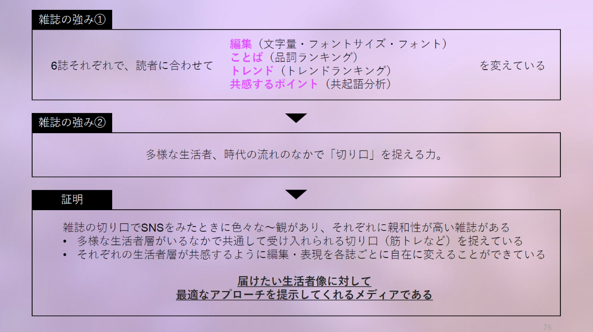 現代社会においては年齢による生活者の価値観や思考の違いが減少しつつあり、生活者がますます複雑になってきている。一口に「〇〇世代」という切り方ではとらえられなくなってきているなかで、今回のデータ分析を通じて、現在における女性誌の役割やマーケティング的な活用方法を可視化できればと思います。