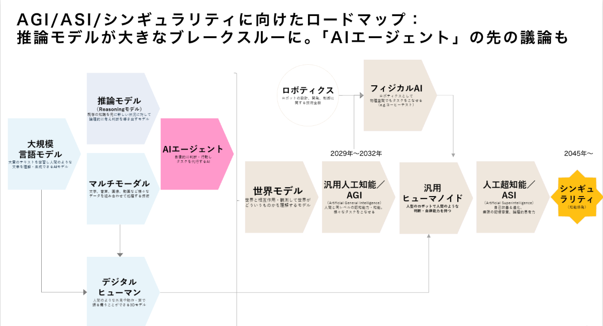 下図は我々が作成したシンギュラリティまでのAI技術ロードマップです。「大規模言語モデル」から始まり、昨年Open AIが発表した「推論モデル」、「マルチモーダル」が進み、それらの成果を受けて「デジタルヒューマン」が活発になっています。さらに推論モデルによって"考える"ということができるようになり、今年は「AIエージェント」が注目されています。そして次のアーキテクチャーとして「世界モデル」が議論され、その先にはAGIが控えています。また、ロボティクスを融合した「フィジカルAI」も迫っています。