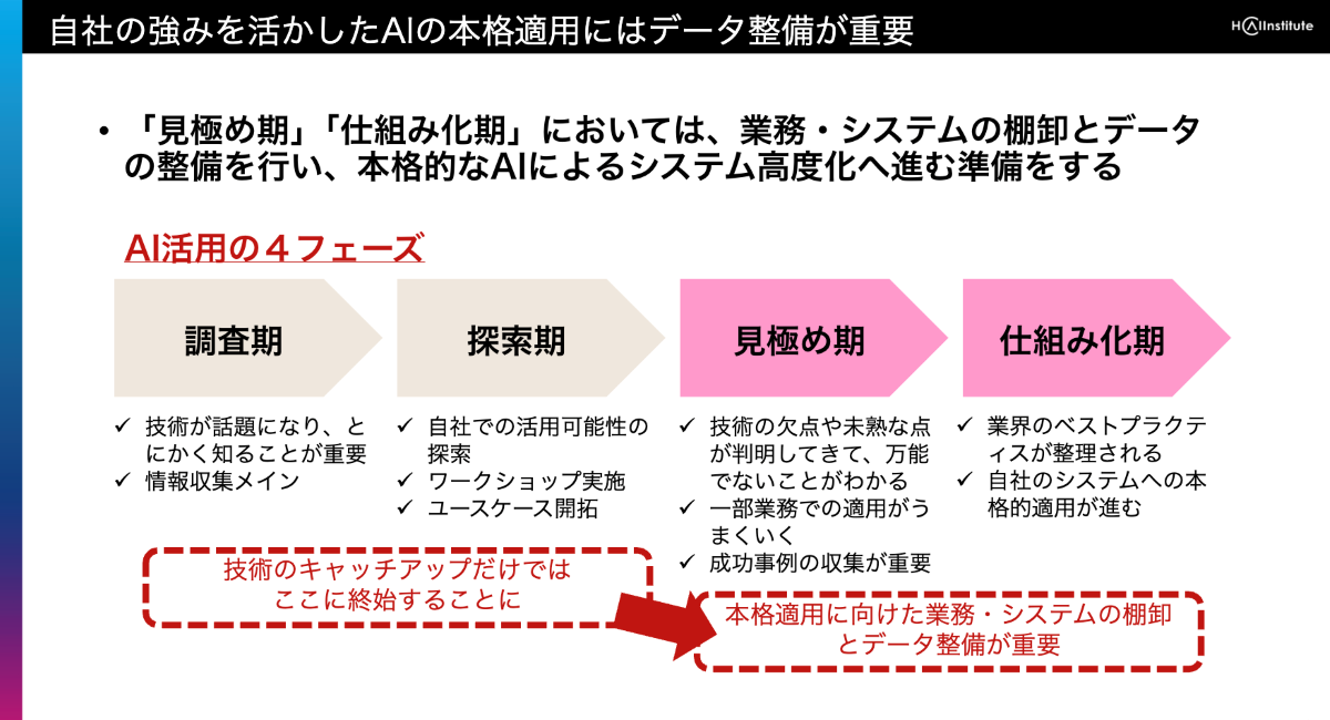 重要なのは、フェーズ3の「見極め期」に進むことです。AIへの期待があったけれど実際は使えなかった、失敗した、という話も出てくる中、成功事例をヒントにして、「活用のコアはここではないか」と自社にとっての独自の有効な活用法を見極める。そして最後が「仕組み化期」。フェーズ3で見極めた活用法を、自社の業務システムや組織のあり方、データを棚卸しして整備し、ビジネスプロセスに埋め込んでいく。この「見極め期」と「仕組み化期」にどう入っていくか。そこが、今まさに問われ始めているのです。