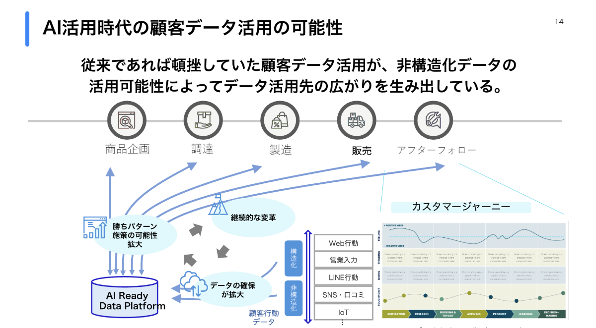 AI活用の成功には「データ量・質の確保」「ユースケースの確立」「継続的な変革」が必要ですが、これらを実施するのは容易ではありません。さらに、AI活用において今後特に重要になるのが、「非構造化データ」の活用です。非構造化データとは、例えばコールセンターにおけるお客様とのやりとりの音声ログや、投稿されたクレームの画像、商談の動画など、これまで具体的な活用が難しかったデータのこと。AIの進化でこうしたデータ群も活用しやすくなり、例えば商品企画から調達、製造、販売、アフターフォローまで、マーケティング活動だけでなくあらゆる業務プロセスで活用が期待されています。これまでは「データを貯める」ことが目的になりがちでしたが、これからはAIとデータを常に行き来しながら、継続的に価値を生み出していく時代になるでしょう。