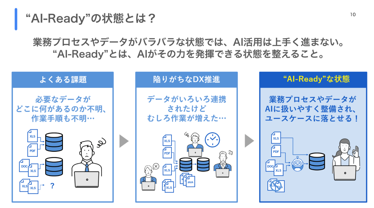 業務プロセスやデータがバラバラな状態では、AIの本来の力を発揮できません。そこで我々が提唱しているのが「AI-Ready」という考え方です。AI-Readyとは、「業務プロセスやデータについて、AIがその力を最大限に発揮できる状態に整えること」と定義しています。業務やデータをAIが扱いやすくなることで、企業が本当にやりたいこと、つまり具体的なユースケースにスムーズに落とし込めるようになるのです。