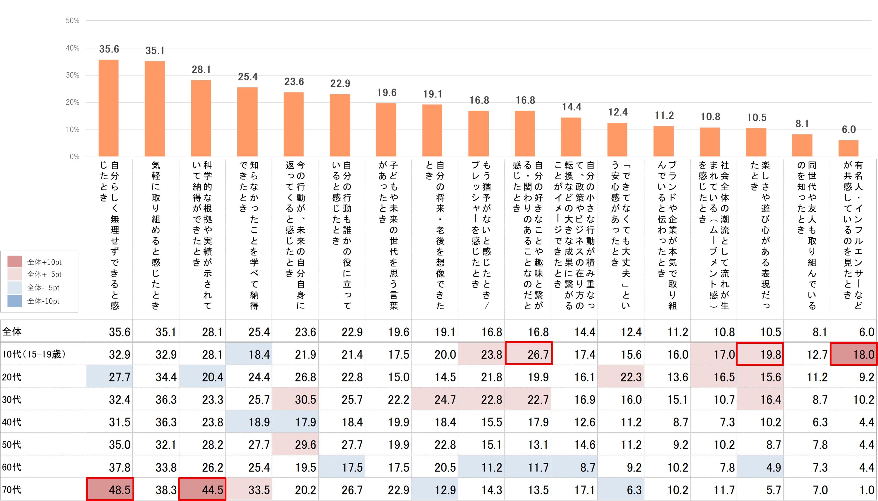 ・一方70代では、「自分らしく無理せずできると感じたとき」(48.5%)、「科学的な根拠や実績が示されていて納得ができたとき」(44.5%)が全体より10pt以上高く、事実をストレートに伝える表現や気づきのあるメッセージが響く傾向。