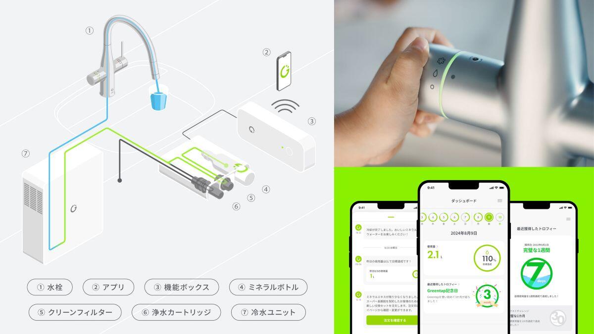 具体的には、家庭で使っている水栓を「Greentap」専用水栓に交換したあと、シンク下に機能ユニットと呼ばれる小さい装置を取り付けます。装置には浄水機能が組み込まれていて、さらにそこにヤシ殻由来のミネラルエキスをプラスすることで、蛇口をひねるだけでおいしいミネラル in ウォーターを飲むことができるというものです。さらにアプリと連動していて、利用した水道水の量や、ミネラルボトルの交換時期などが確認できるようになっています。