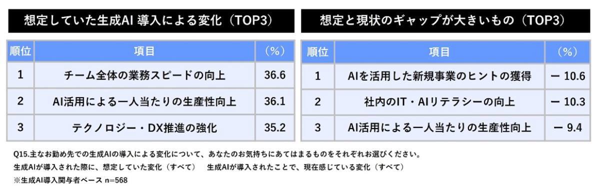 実際、生成AI導入に関与した担当者を対象とした調査データを見ても、導入前に期待していた「一人当たりの生産性向上」や「IT・AIリテラシーの向上」といった効果に対し、現状の実感が追いついていないというギャップが浮き彫りになっています。