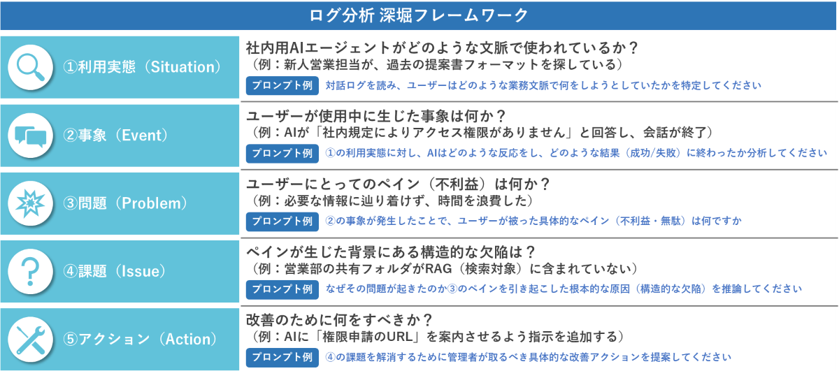 「AIのログをAIに分析させる」ことで、大量のテキストデータの中から「どのような利用実態があるか」「どのような課題が発生しているか」といった要素を構造化し、抽出することが可能になります。