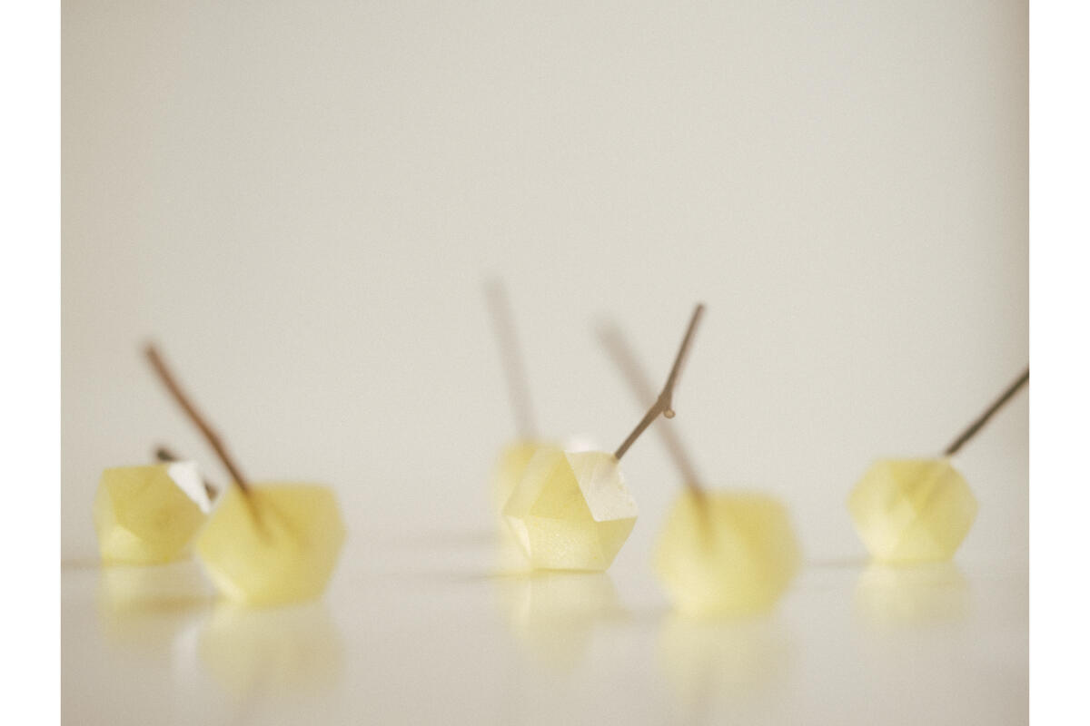 代表作の「鉱物の実」がまさにそうです。制作のきっかけは、お正月に飾る、木の枝に紅白の餅を飾り付けた「餅花」をあのまま食べられたらいいな、というシンプルな発想でした。