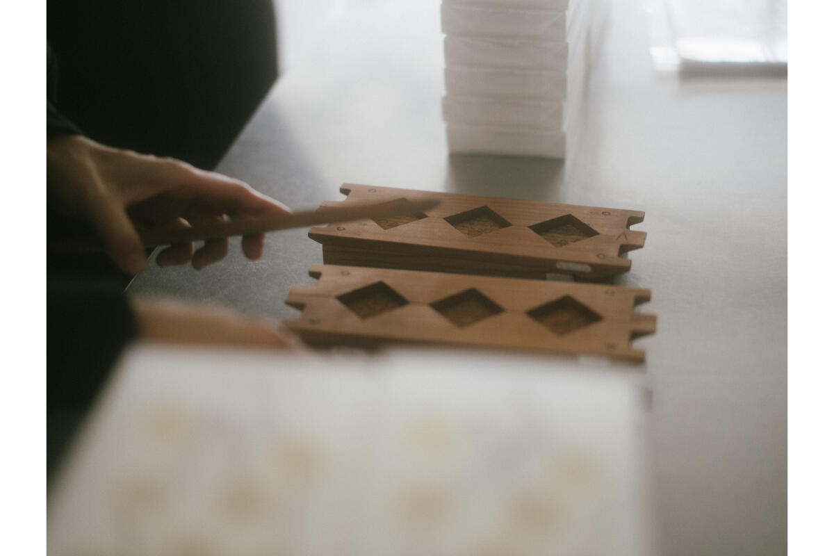 実際、1年以上かかりましたね。生地だけでなく、木型も特殊な製法で作ることになりました。「宝相華」の生地を詰めたときに繊細な模様が浮き上がり、その意味がきちんと伝わるように、正確に表現したかったんです。そんなオーダーを忠実に叶えてくださったのは、仏像を彫る仏師(ぶっし)さんでした。
