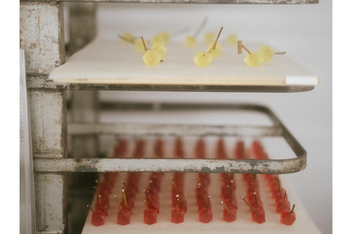 最初は実際の木の枝に餡入りのお団子をつけてみたのですが、それだと重力に負けて落ちてしまう。これは、"なっていない"状態です。ところが、試行錯誤の中で琥珀糖を使ったところ、うまくいきました。琥珀糖って最初は寒天で、周りが結晶化することで琥珀糖になるのですが、それがしっかりと枝を抱え込むように接着したんです。