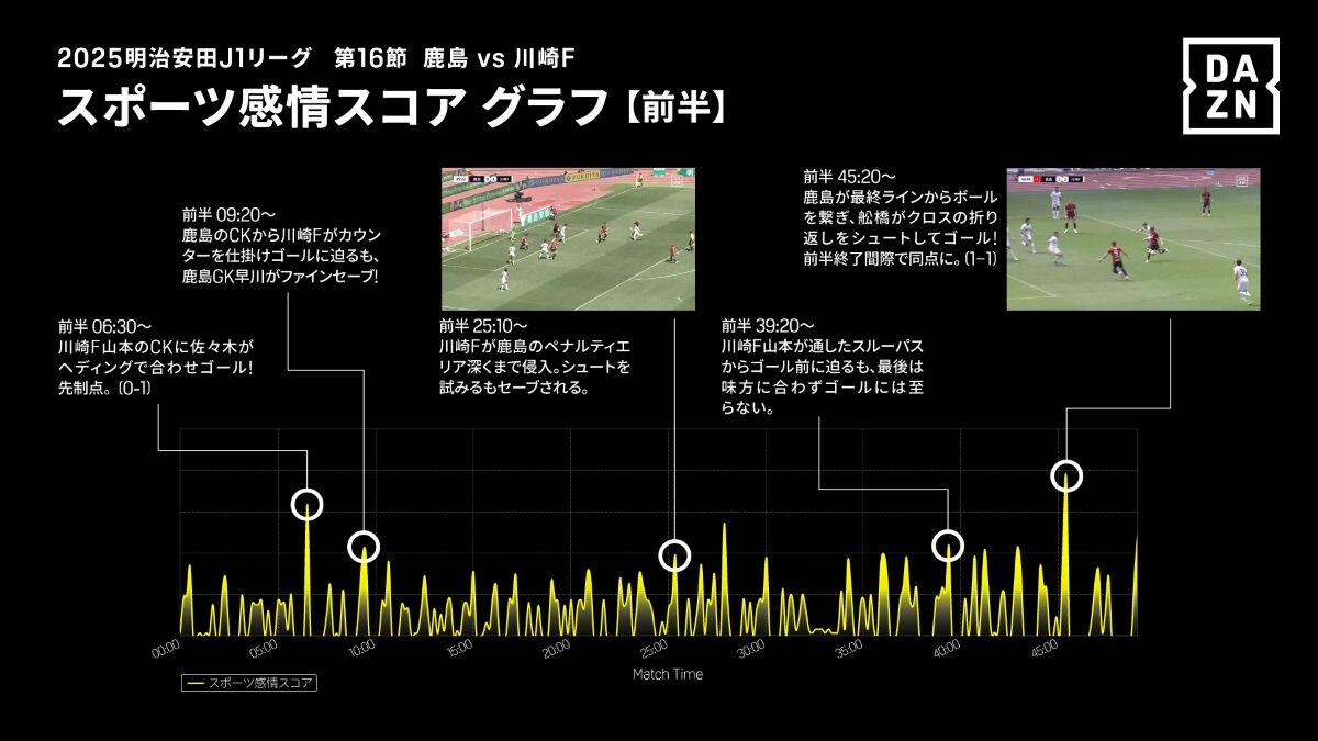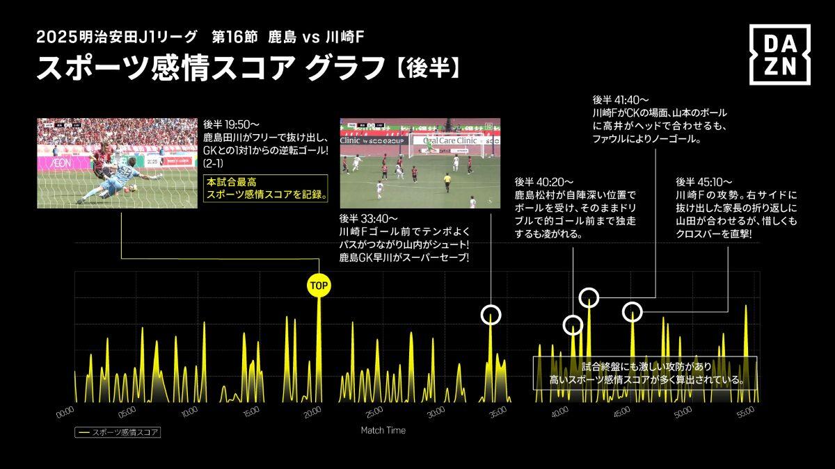 感情の盛りあがりが高いプレーを可視化できると、たとえばハーフタイムの間に前半いちばん熱狂したシーンをリプレイできたりするサービスがDAZNで楽しめるといった視聴体験のアップデートにもつながりますよね。
